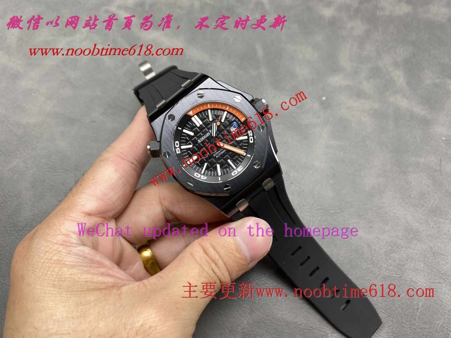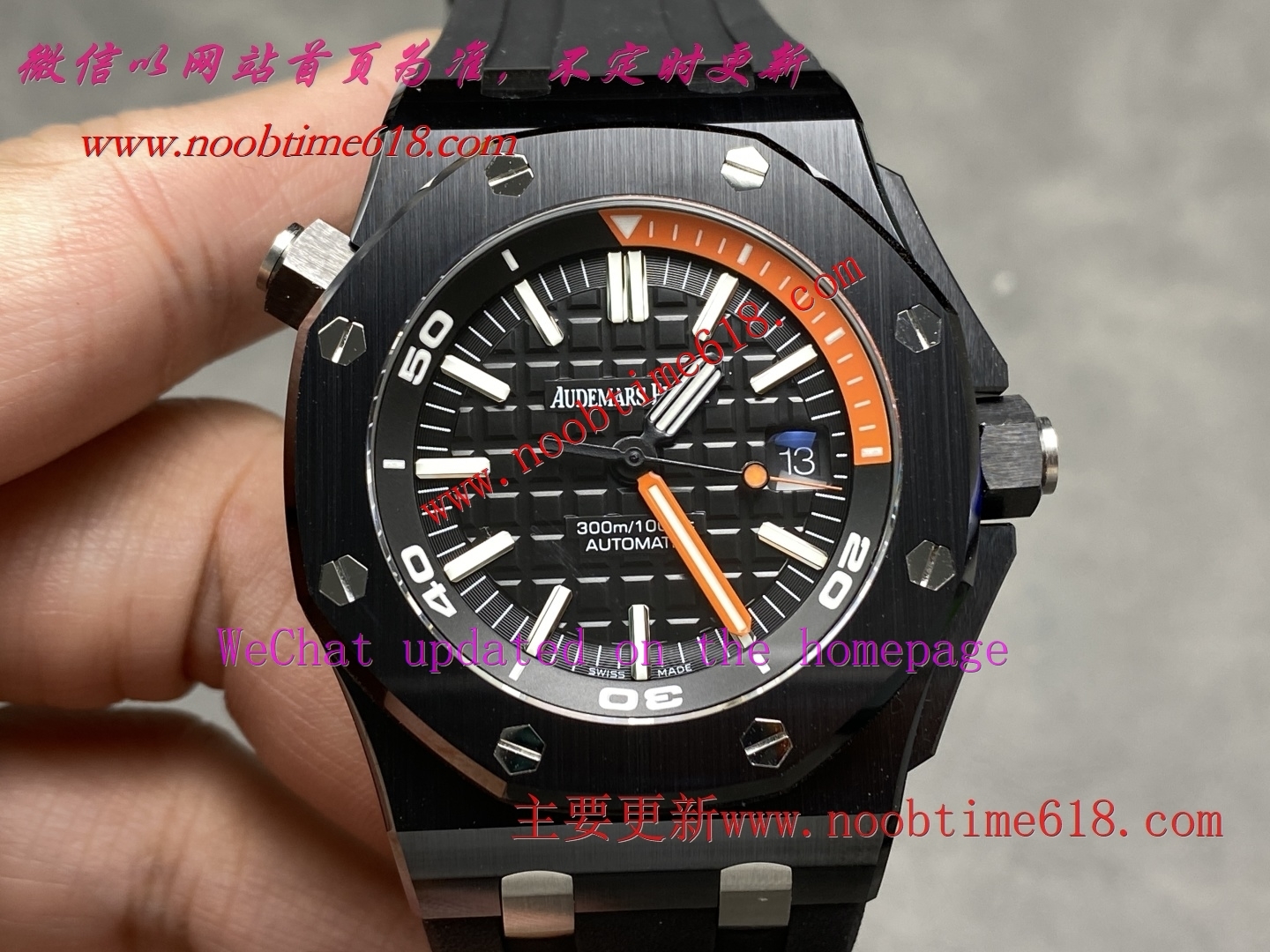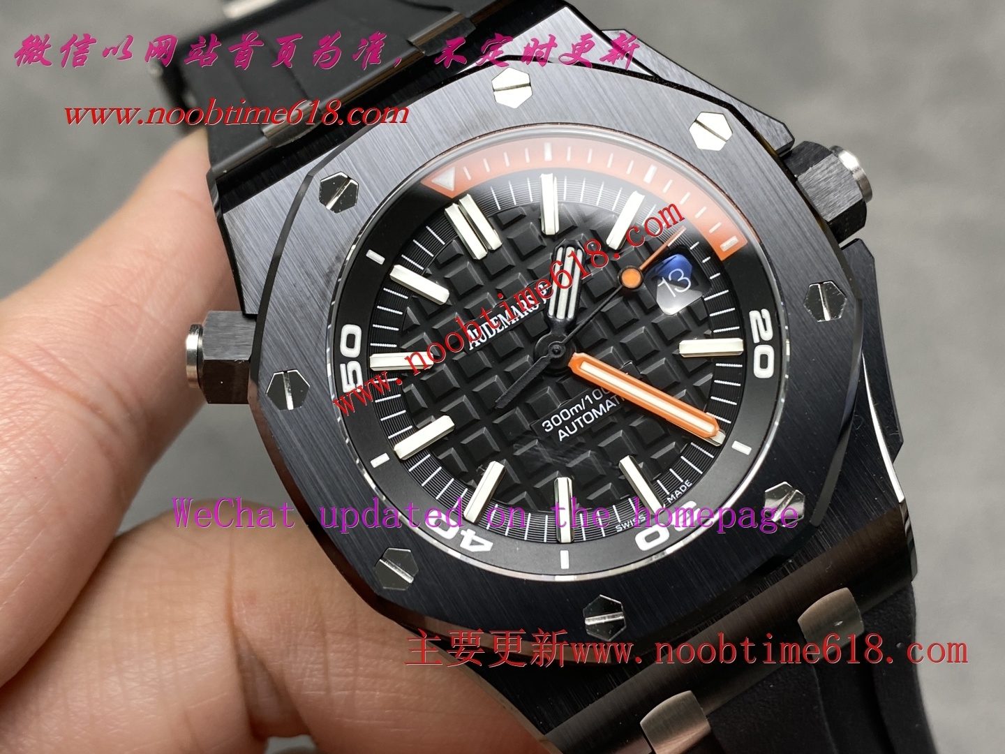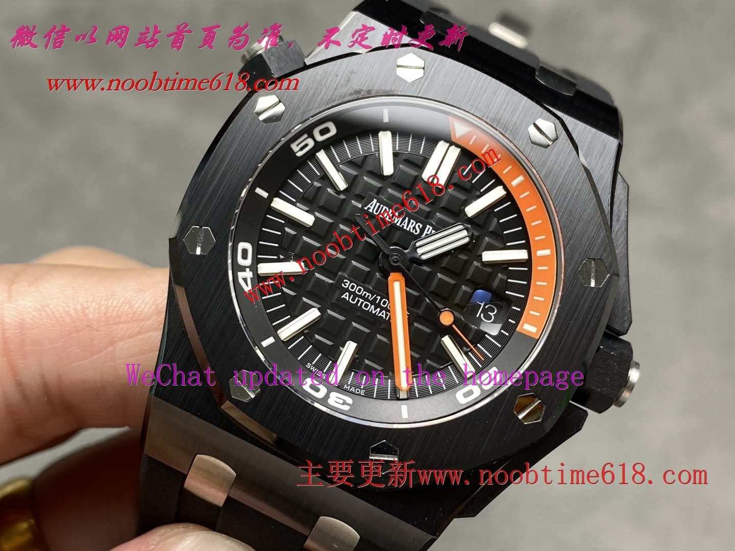 3⃣️字面: 表盘同样采用黑色调和橙色15分钟计时完美协调,表盘采用超大格纹装饰,搭配白金荧光立体时标和皇家橡树指针,橙色旋转内表圈搭配潜水刻度和蓝色60-15分钟区域与原装一致