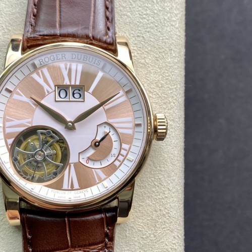 AX出品羅傑杜彼HOMMAGE致敬系列陀飛輪RDDBHO0568腕表複刻手錶 ,歷經兩年實現8點位置真陀飛輪機芯,模擬原裝RD540機芯數據,機芯結構和傳動幾乎一致,42mm尺寸更適合亞洲男士商務使用。18K真空鍍金不易掉色,最大限度還原原裝殼型。,藍寶石玻璃 ,義大利牛皮,原廠樣式蝴蝶扣,12點位置大日曆顯示 4點鐘位置動能顯示。錶盤分為三層,中央裝飾白色漆面,第二層玫瑰金圓環和白色漆面羅馬數字,外層為白色漆面裝飾外緣,粉色轉印分鐘圈層次清晰,讀時簡單明瞭。大日曆顯示。 N廠,N廠手錶,高仿勞力士,高仿手錶,精仿手錶,仿表,複刻手錶,複刻表,一比一複刻手錶